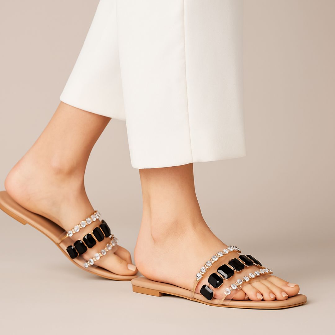 Step into glamour with the Emerald Luxe Crystal Slide – where comfort meets opulence. Crafted with a nude base for a barely-there elegance, this slide features two transparent straps adorned with dazzling emerald-cut green gems and shimmering crystal rhinestones. Whether you're dressing up a casual outfit or making a statement at an evening event, these slides add instant sparkle and sophistication to every step