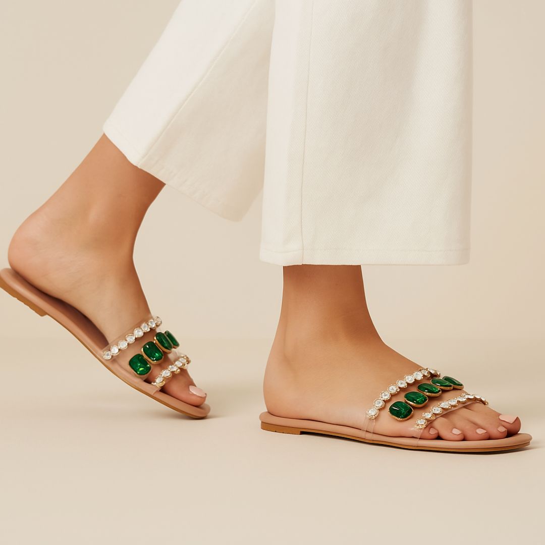 Step into glamour with the Emerald Luxe Crystal Slide – where comfort meets opulence. Crafted with a nude base for a barely-there elegance, this slide features two transparent straps adorned with dazzling emerald-cut green gems and shimmering crystal rhinestones. Whether you're dressing up a casual outfit or making a statement at an evening event, these slides add instant sparkle and sophistication to every step