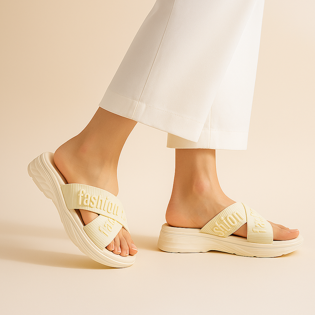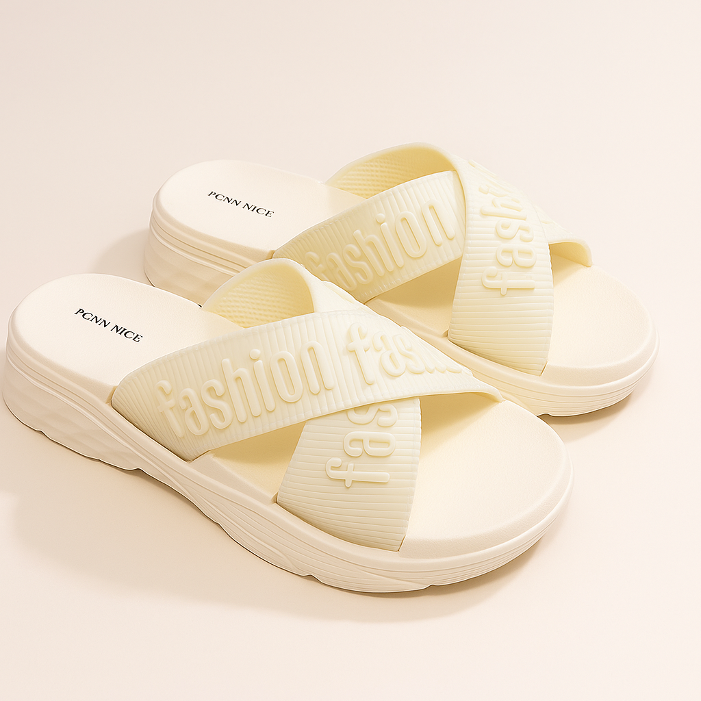 Step into effortless style with these chic cross-strap fashion slides. Designed in a soft ivory tone with bold “fashion” embossed straps, they blend comfort and trend seamlessly. The cushioned sole ensures all-day ease, while the lightweight design makes them perfect for casual outings, daily wear, or lounging in style. Pair them with jeans, wide-leg pants, or summer dresses for a relaxed yet fashionable look.