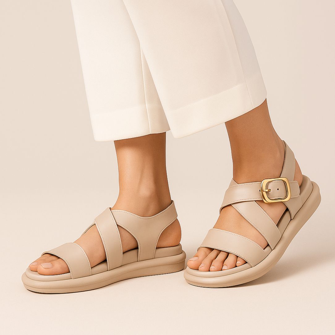 Walk with style and ease in these beige strappy sandals. Featuring a sleek gold buckle and cushioned sole, they bring together modern design and all-day comfort — perfect for casual chic looks.