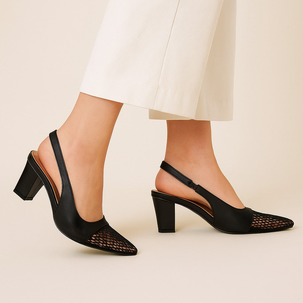 Step into effortless elegance with these Black Pointed Sling back Heels. Designed with a chic pointed toe featuring breathable mesh detailing, this pair brings a modern twist to classic sophistication. The comfortable block heel and secure sling back strap offer all-day support, making them perfect for both office wear and evening outings. Whether you're dressing up for a formal event or elevating your everyday look, these heels are a versatile addition to any wardrobe.