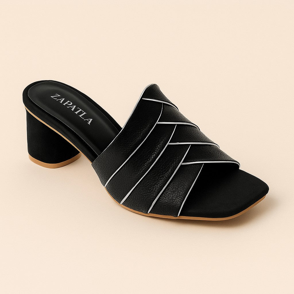 Step into effortless elegance with these black block-heel mules, crafted with layered crossover straps accented by fine metallic piping. Designed for both style and comfort, they pair perfectly with everyday wear or a chic evening look.