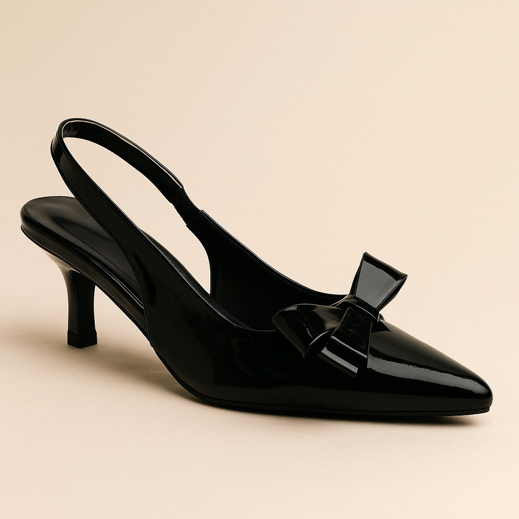 Step into elegance with these glossy burgundy black slingback heels, crafted in patent finish for a bold yet classy appeal. Designed with a sleek pointed toe, they feature a statement bow on the vamp for a touch of sophistication. The mid-height heel ensures all-day comfort, making them perfect for both formal and festive occasions.