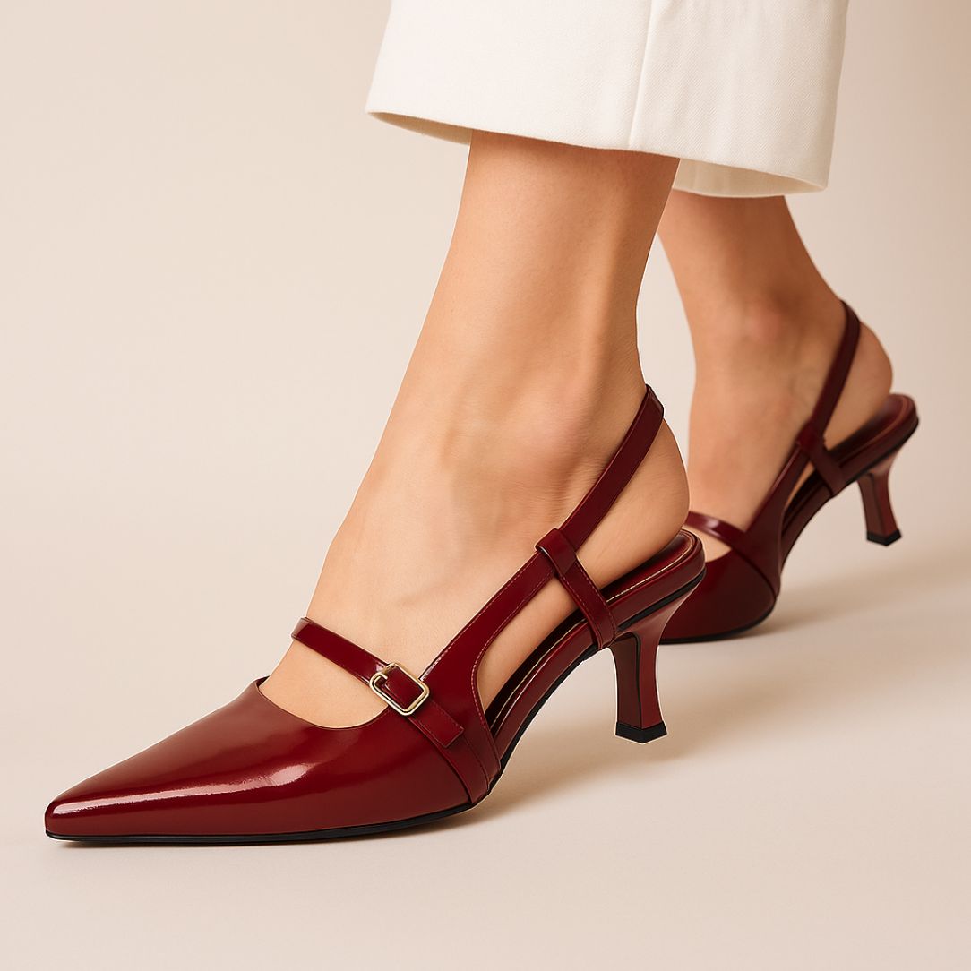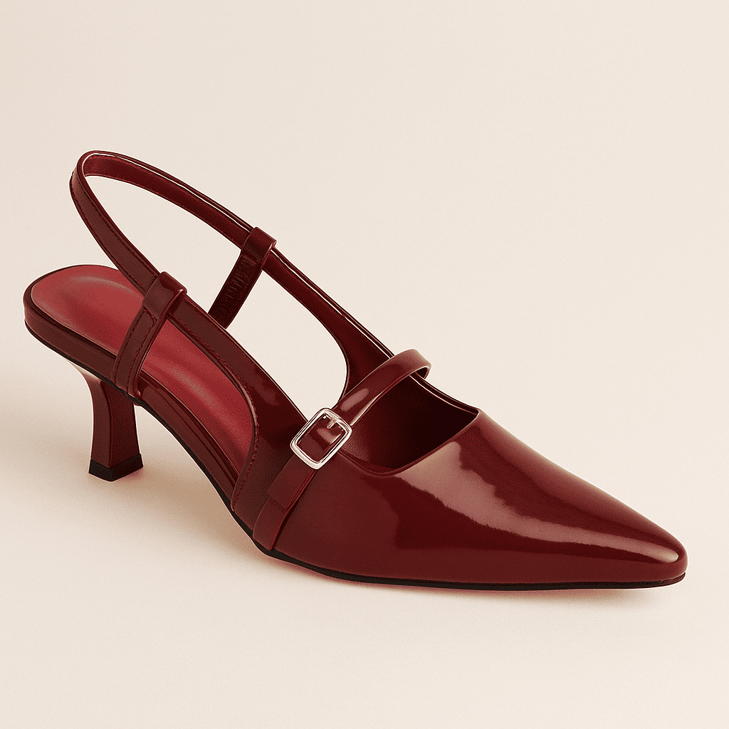 Step into timeless elegance with these glossy Maroon slingback heels. Designed with a sleek pointed toe and a chic buckle strap, they bring a perfect balance of sophistication and comfort. The mid-heel height makes them versatile for both day-to-night wear, while the patent finish adds a touch of modern glamour. Ideal for office meetings, evening outings, or any occasion where style meets confidence.