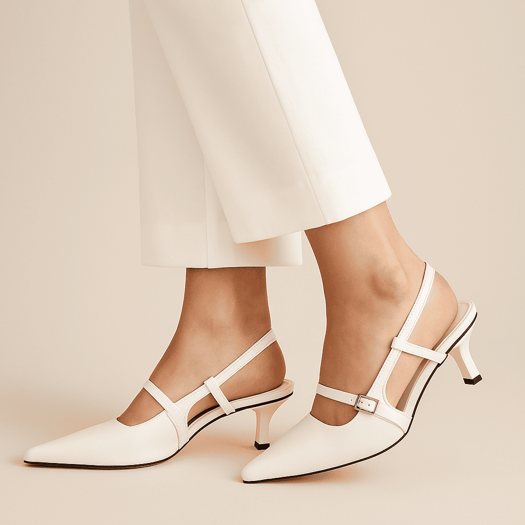 Step into timeless elegance with these glossy White slingback heels. Designed with a sleek pointed toe and a chic buckle strap, they bring a perfect balance of sophistication and comfort. The mid-heel height makes them versatile for both day-to-night wear, while the patent finish adds a touch of modern glamour. Ideal for office meetings, evening outings, or any occasion where style meets confidence.