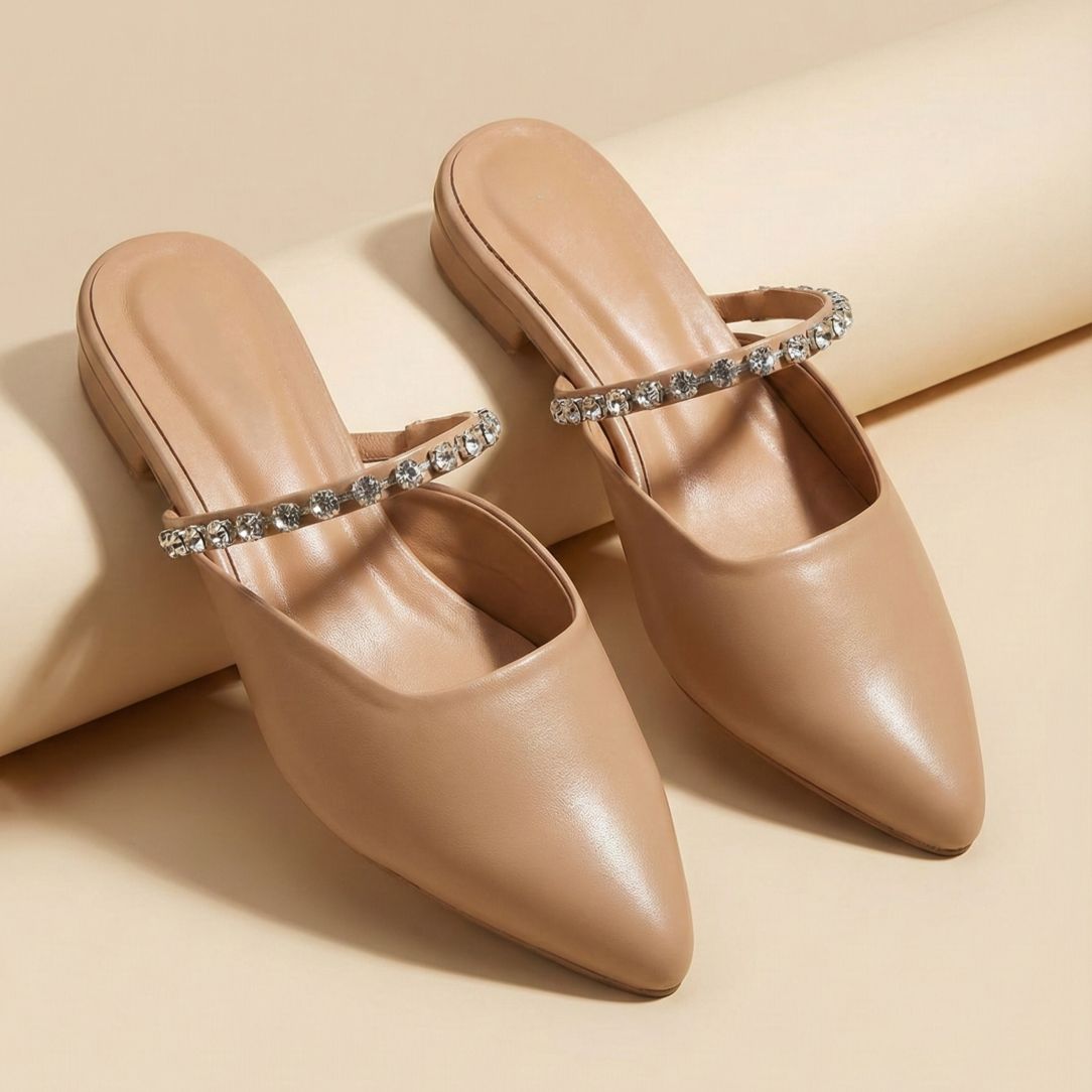 Step into effortless elegance with these Beige Crystal Strap Mules, designed for women who love subtle glamour with everyday comfort. Featuring a sleek pointed toe silhouette and a delicate crystal-embellished strap, this pair adds a refined sparkle to your look without being overpowering.