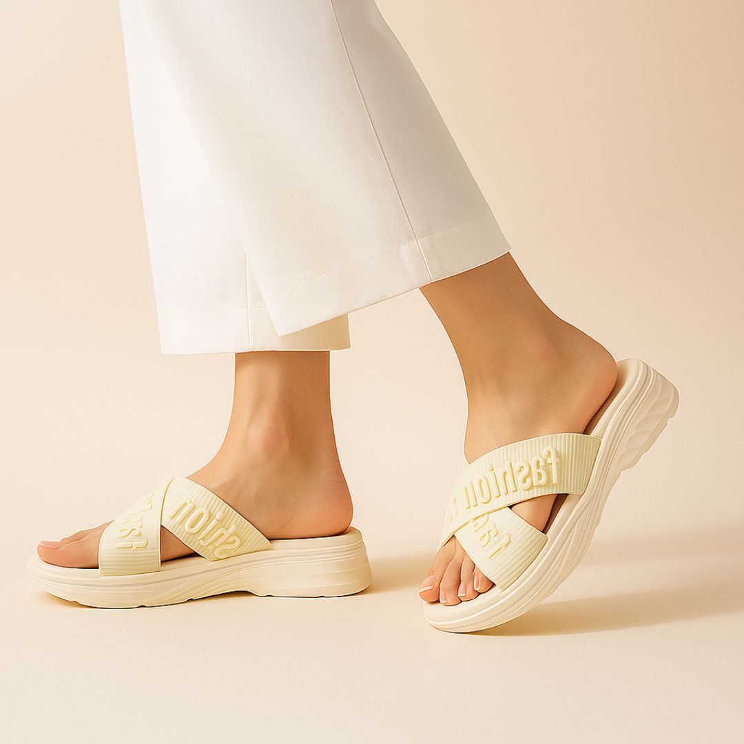 Step into effortless style with these chic cross-strap fashion slides. Designed in a soft ivory tone with bold “fashion” embossed straps, they blend comfort and trend seamlessly. The cushioned sole ensures all-day ease, while the lightweight design makes them perfect for casual outings, daily wear, or lounging in style. Pair them with jeans, wide-leg pants, or summer dresses for a relaxed yet fashionable look.
