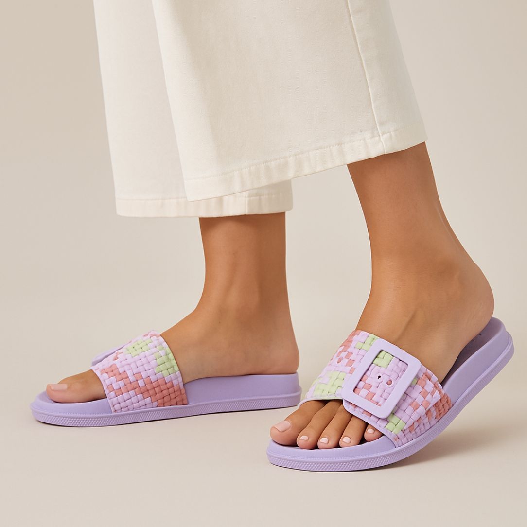 Step into playful comfort with our Pixel Charm Slides. Designed in a soft pastel lilac base, these slippers feature a woven pixel-effect strap in candy-inspired shades of pink, green, and purple, finished with a bold buckle for a trendy touch. Lightweight, comfy, and stylish — they’re the perfect pair for your everyday wear, from casual outings to relaxing at home.