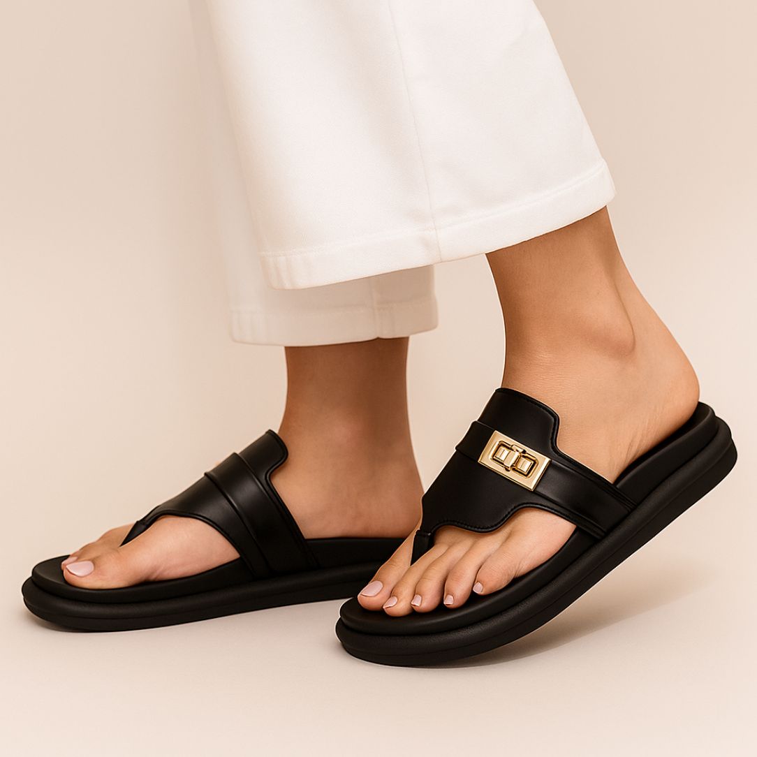 Step into effortless chic with these black slip-ons, styled with a luxe gold buckle accent. Designed on a cushioned black sole, they bring you the perfect blend of comfort and everyday glam.