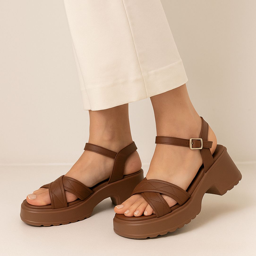 Step into effortless style with these brown block-heel sandals. Designed with soft crisscross straps and neat contrast stitching, they offer both elegance and comfort for everyday wear. The cushioned insole and sturdy chunky heel make them perfect for long hours, while the adjustable ankle strap ensures a secure fit. A versatile pick that pairs beautifully with casual denim, chic dresses, or summer outfits.