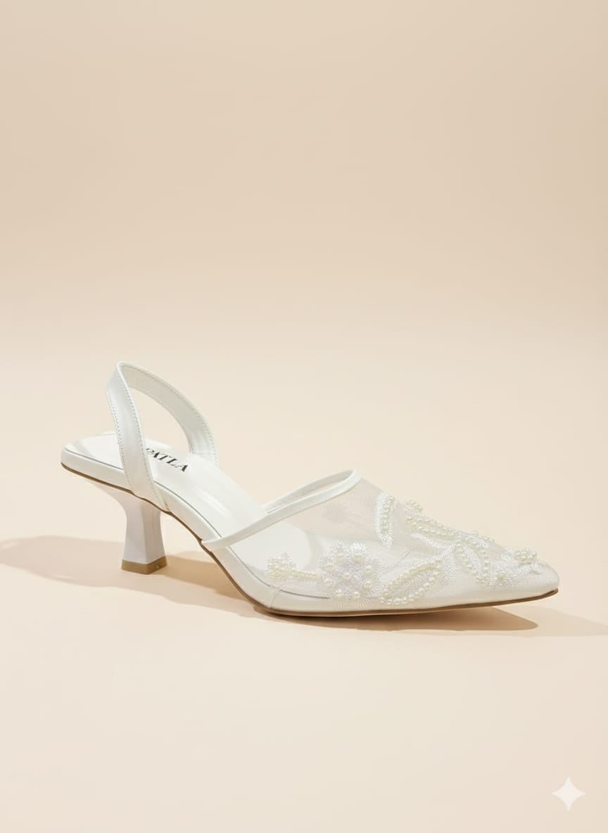 Step into timeless elegance with our Noir Bloom Slingbacks. Crafted in sheer fawn mesh, delicately embroidered with beaded floral patterns, these pointed-toe slingbacks redefine sophisticated glamour. The sleek strap provides a secure fit, while the cushioned insole ensures all-day comfort. Perfect for evening occasions, formal gatherings, or adding a touch of luxury to your everyday style, these heels combine classic charm with modern refinement.
